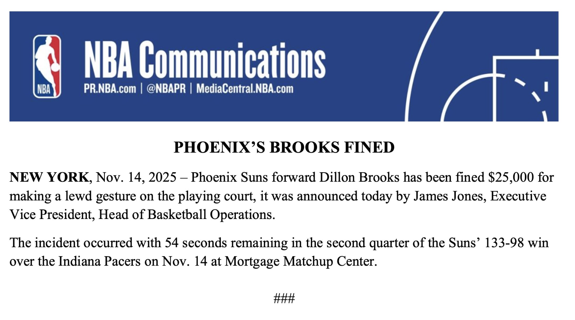 虎扑11月15日讯 今日NBA官方宣布,狄龙-布鲁克斯因在场上做不雅动作而被罚款2.5万美元。龙场
